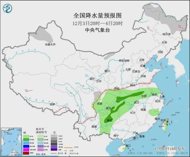 5)冷空气减弱南下,西南地区东部等地将有小到中雨★★。12月3日20时至4日20时★,新疆沿天山地区、内蒙古东北部、黑龙江大部、川西高原东部等地部分地区有小雪或雨夹雪。西北地区东南部★、黄淮南部、江淮★★、江汉、江南西部、西南地区东部、广西西北部★、福建北部、台湾岛东部等地部分地区有小到中雨。