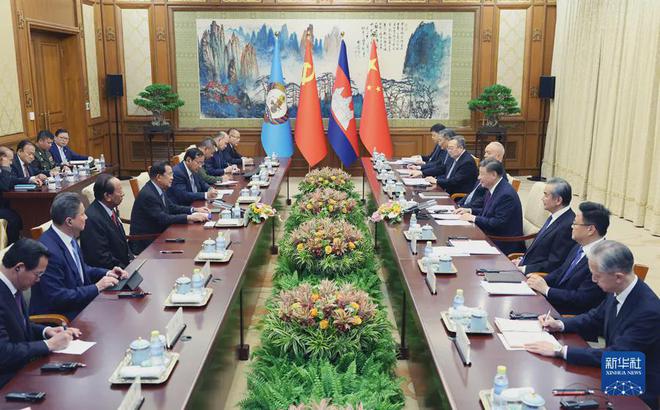 12月3日,习在北京钓鱼台国宾馆同柬埔寨人民党主席、参议院主席洪森举行会谈。
