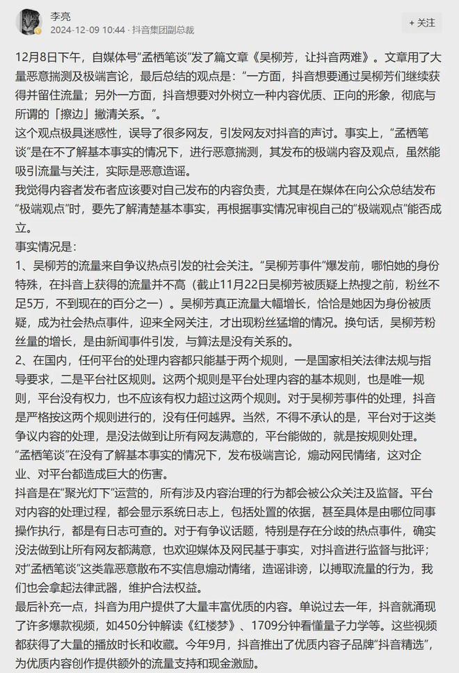 【抖音副总裁谈“吴柳芳事件”】12月9日抖音集团副总裁李亮发文谈及“吴柳芳事件”。李亮表示,自媒体号★“孟栖笔谈”文章《吴柳芳,让抖音两难》用了大量恶意揣测及极端言论,最后总结的观点是:“一方面,抖音想要通过吴柳芳们继续获得并留住流量★★;另外一方面★★,抖音想要对外树立一种内容优质、正向的形象★,彻底与所谓的‘擦边’撇清关系。”★★★。他认为★★★,这个观点极具迷惑性,误导了很多网友★★,引发网友对抖音的声讨★★。事实上,“孟栖笔谈”是在不了解基本事实的情况下★★★,进行恶意揣测,其发布的极端内容及观点★★★,虽然能吸引流量与关注★★,实际是恶意造谣★★。(腾讯新闻)