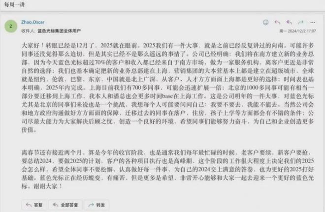 【蓝色光标回应“要求员工南迁★★”★★:在上海建新业务总部★★★,2025年内完成】12月9日一封蓝色光标内部邮件在网络流传★★★。内部邮件称,蓝色光标将在上海建立新的业务总部★,并将在2025年内完成★★。邮件内容还提到★★,“上海目前我们有700多同事,可能会迅速扩展一倍,北京的1000多同事可能有相当一部分要迁移到上海工作。公司会和地方政府沟通做好方方面面的保障★★★,迁移过去的同事在落户★、住房★★★、孩子上学等方面都会有不错的条件★,公司尽最大能力为大家解决后顾之忧★★,创造一个良好的环境。★”对此★★★,蓝色光标官方回应称,“上市公司的总部肯定得在北京不会搬,只是上海将作为蓝标的华东业务总部。”此外,如果不愿搬迁新总部而选择离职,针对赔偿问题,有员工告诉新浪科技,★“按照正规的N+1拿赔偿★。”(新浪科技)