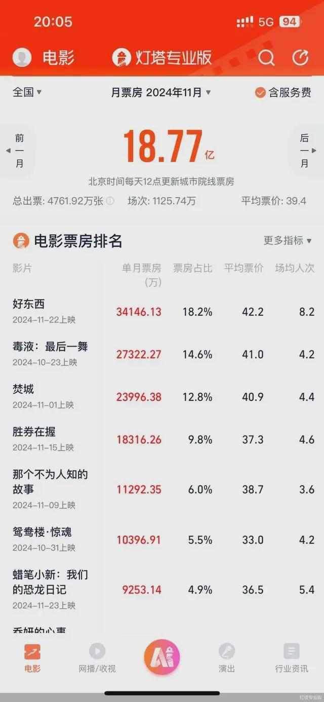 【11月电影全国总票房18.77亿元,同比增长11.4%】12月9日消息★★★,灯塔专业版发布2024年11月电影市场报告。据报告★★,11月电影全国总票房18.77亿元★★★,同比增长11★★.4%。11月当月票房破千万影片25部,明显高于去年11月的18部,持平2019年★★。(北京商报)