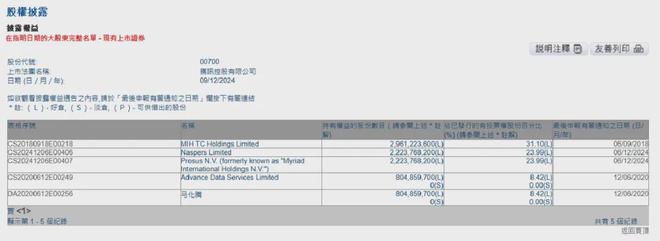 【腾讯大股东Prosus继续减持:持股比例降至23.99%】12月9日消息★,港交所文件显示,12月6日★★★,腾讯控股大股东、南非Naspers集团荷兰子公司Prosus出售47.4万股腾讯控股H股,每股平均价410★★.0358港元,持股比例由24.01%降至23★★.99%★,现持股总数约22★.24亿股★★。今年以来Prosus减持腾讯速度有所放缓★★★,据此前披露★★,4月初至9月底半年减持约7058.61万股腾讯,套现33亿美元;10月1日至11月27日期间进一步沽出2642.45万股,持股降至22.27亿股左右★。(界面新闻)