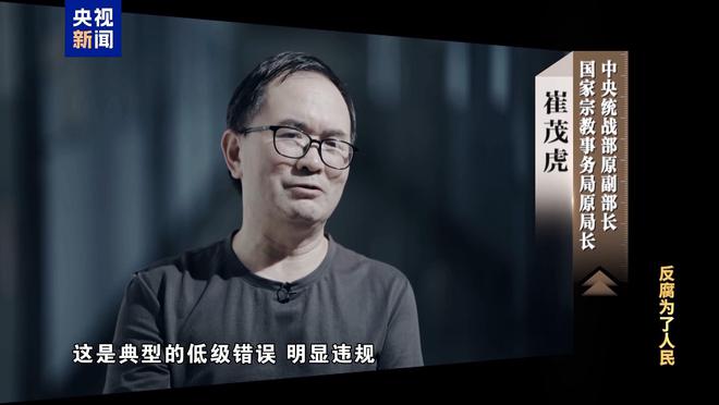 2025年1月6日晚,央视播出中央纪委国家监委电视专题片《反腐 为了人民》第二集《风腐同查同治》。本集共选取了三个典型案例,其中包括国家宗教事务局原局长崔茂虎奢靡享乐★,为捞取个人“显绩”违法占用耕地问题。